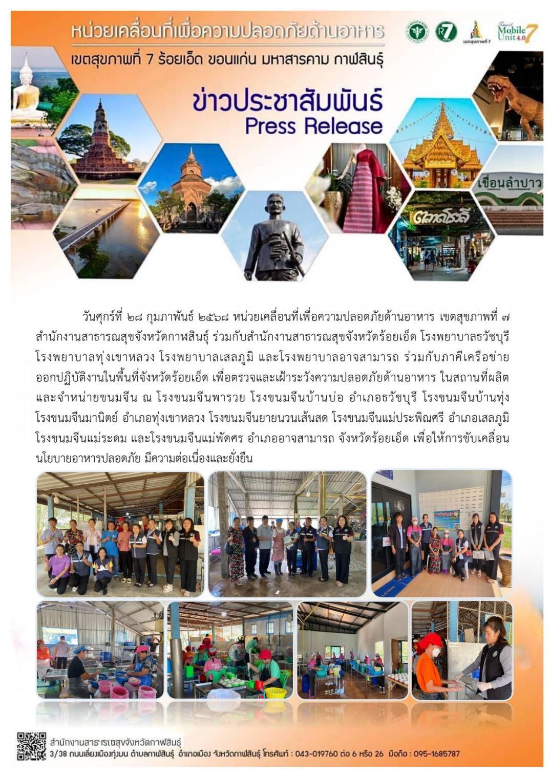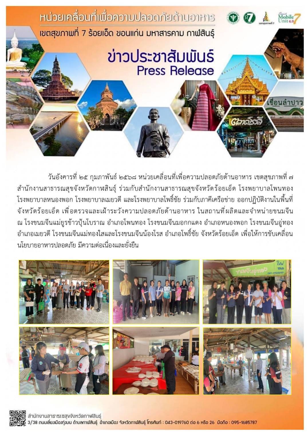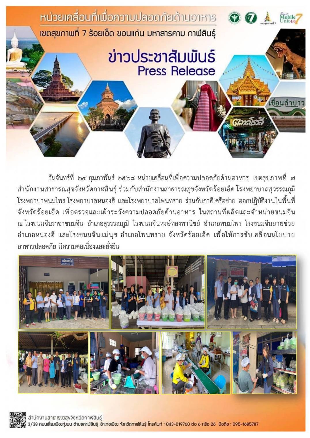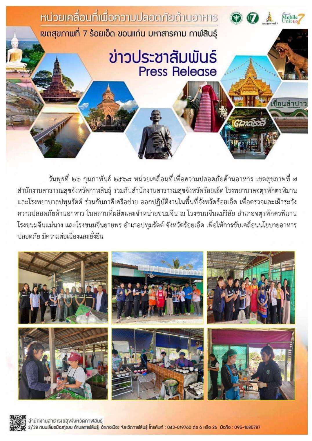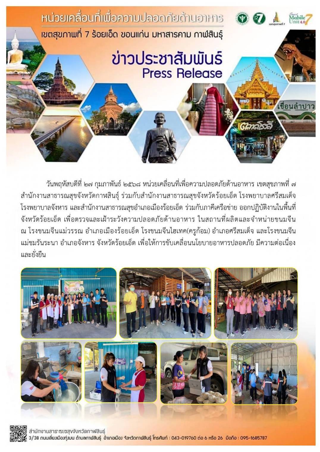 27ก.พ., 2025 ตรวจและเฝ้าระวังความปลอดภัยด้านอาหาร อ.เมืองร้อยเอ็ด อ.ศรีสมเด็จ และ อ.จังหาร จ.ร้อยเอ็ด