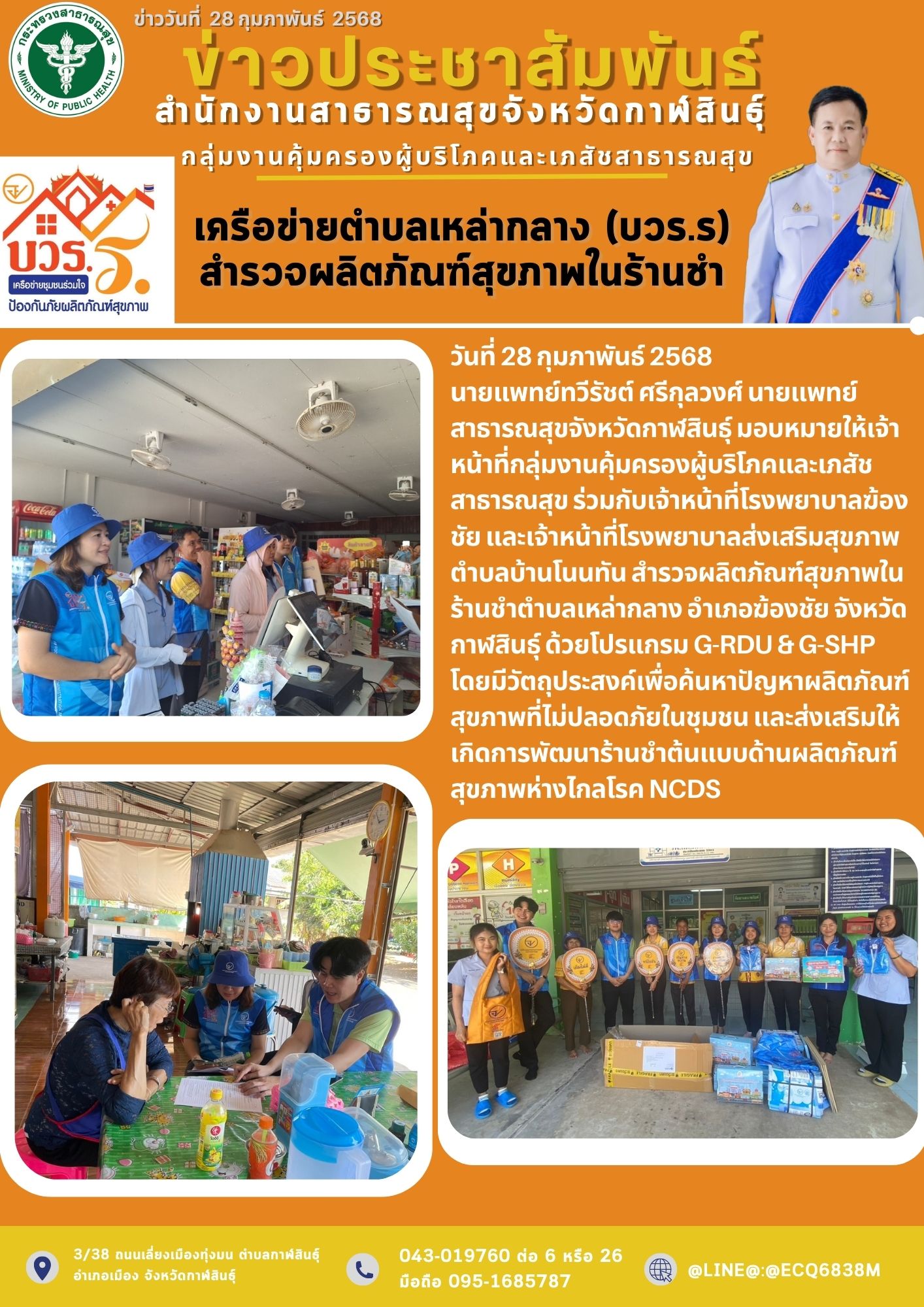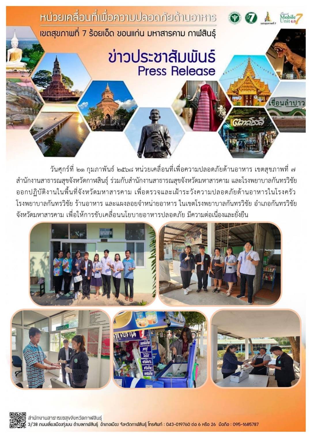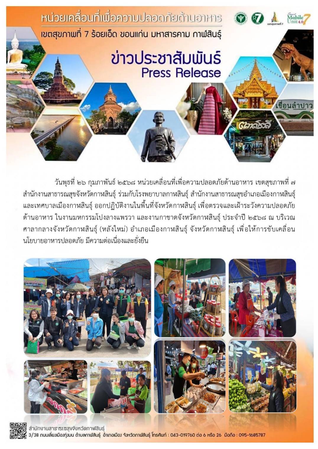26ก.พ., 2025 ตรวจและเฝ้าระวังความปลอดภัยด้านอาหาร ในงานมหกรรมโปงลางแพรวา และงานกาชาดจังหวัดกาฬสินธุ์ ประจำปี 2568