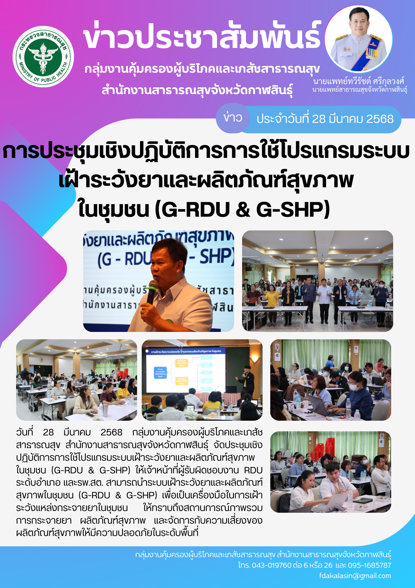 28มี.ค., 2025 การประชุมเชิงปฏิบัติการการใช้โปรแกรมระบบเฝ้าระวังยาและผลิตภัณฑ์สุขภาพในชุมชน (G-RDU & G-SHP)