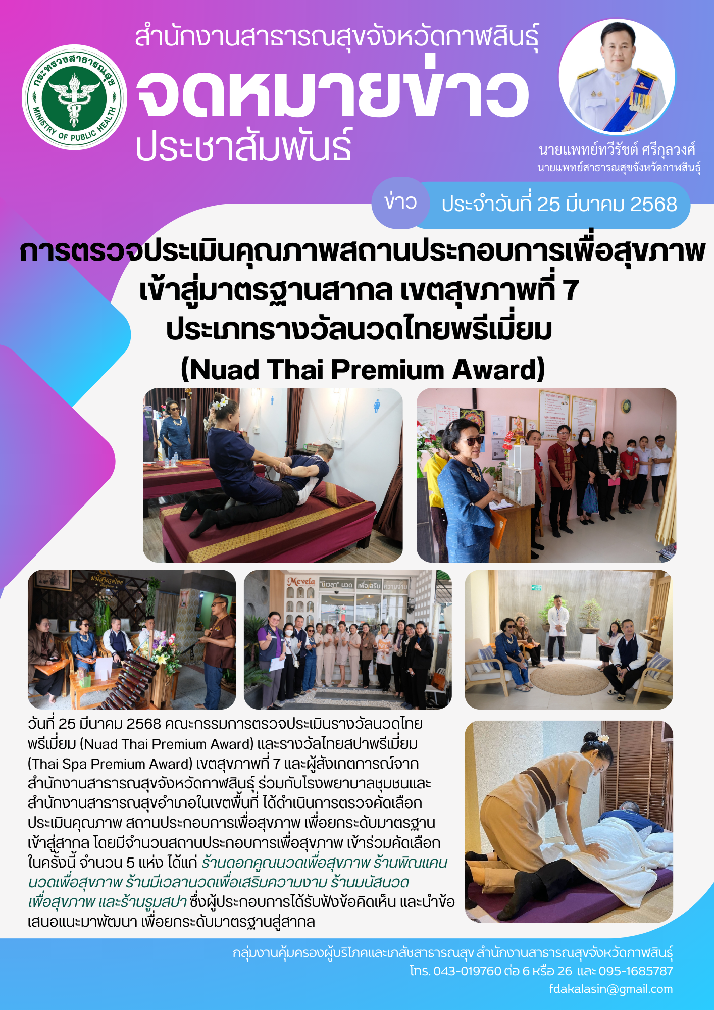 25มี.ค., 2025 ตรวจประเมินคุณภาพสถานประกอบการเพื่อสุขภาพ เข้าสู่มาตรฐานสากล เขตสุขภาพที่ 7 ประเภทรางวัลนวดไทยพรีเมี่ยม