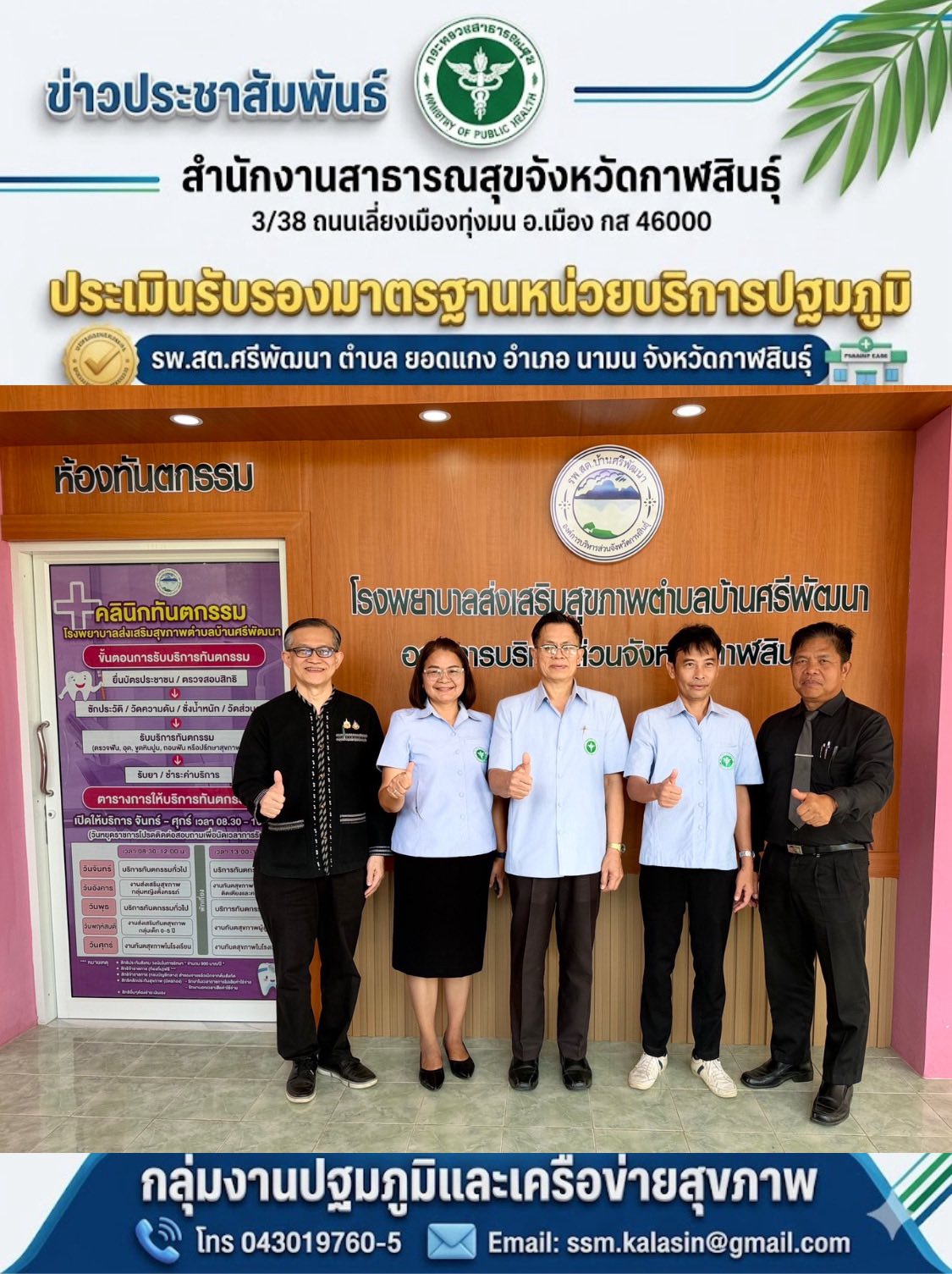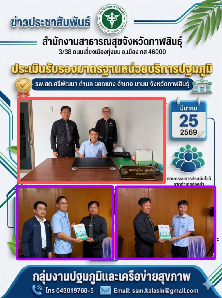 ลงพื้นที่ตรวจประเมินรับรองคุณภาพและมาตรฐานในการให้บริการสุขภาพปฐมภูมิ ณ โรงพยาบาลส่งเสริมสุขภาพตำบลบ้านศรีพัฒนา ตำบลยอดแกง อำเภอนามน จังหวัดกาฬสินธุ์